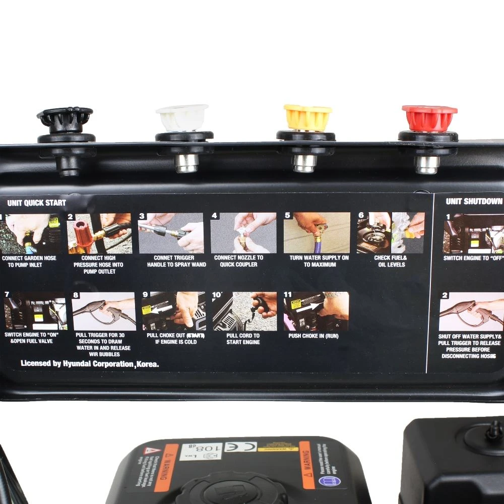 The Hyundai 210cc 4 stroke petrol engine has tremendous mid range torque so the jet washer does not have to be operated at maximum revs while cleaning. This makes for a more pleasant, quieter user experience and reduces fuel consumption, whilst promoting long engine life.