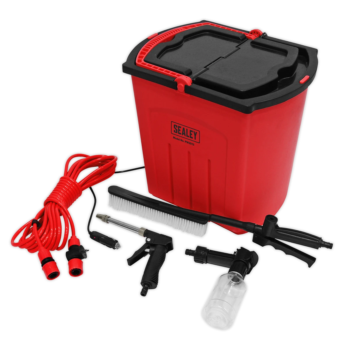 Lightweight, portable pressure washer which can hold up to 25L of water. Ideal for use where a mains power or water supply is not available, such as car shows, track days, window cleaning or even garden use. Unit is powered using a 3m cable fitted with a 12V vehicle accessory socket plug. Supplied with 8m hose, variable nozzle lance, detergent bottle and a long fixed brush. Detergent can also be added to the main tank. Fitted with a strong carry handle.